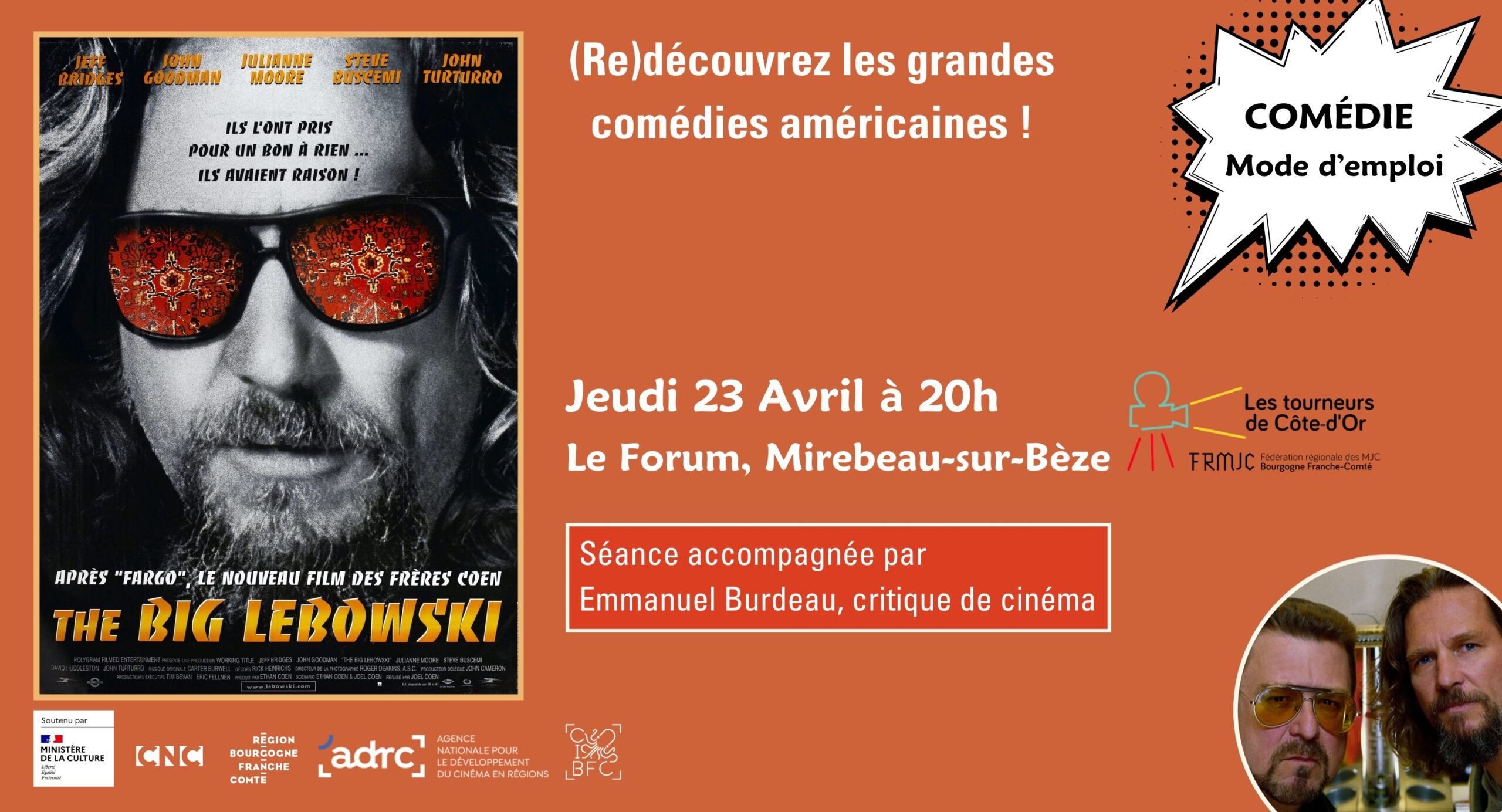 Projection du film culte des frères Coen The Big Lebowski (1998, 1h 57minn) en présence du critique de cinéma Emmanuel Burdeau. Cette projection s’inscrit dans le cadre du cycle patrimoine “Comédie Mode d’emploi” des CIBFC.